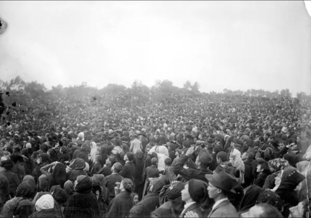 From the road, where some vehicles were parked and where hundreds of people who had not dared to brave the mud were congregated, one could see the immense multitude turn toward the sun, which appeared free from clouds and in its zenith. It looked like a plaque of dull silver, and it was possible to look at it without the least discomfort. At that moment a great shout went up, and one could hear the spectators nearest at hand shouting: “A miracle! A miracle!”